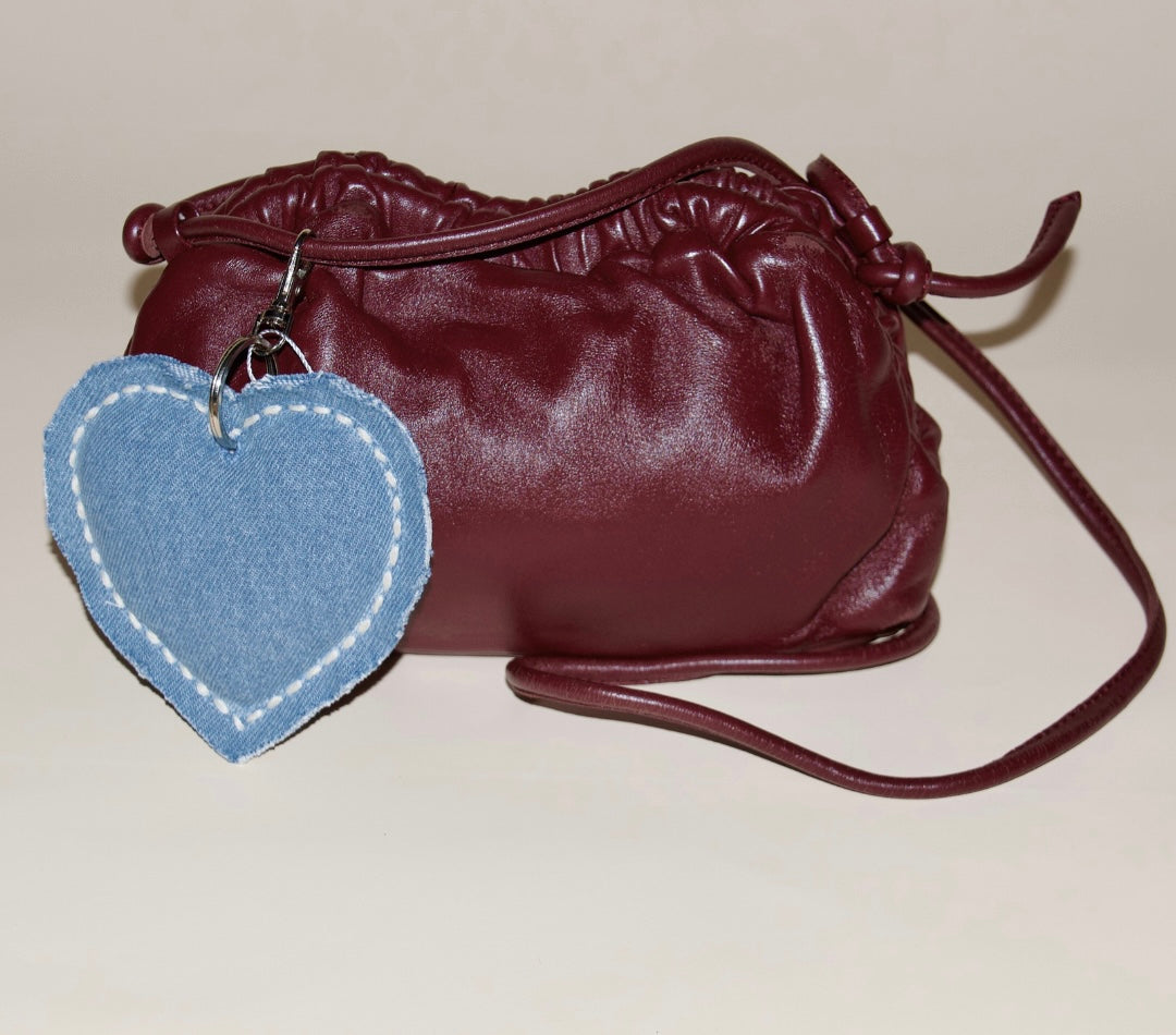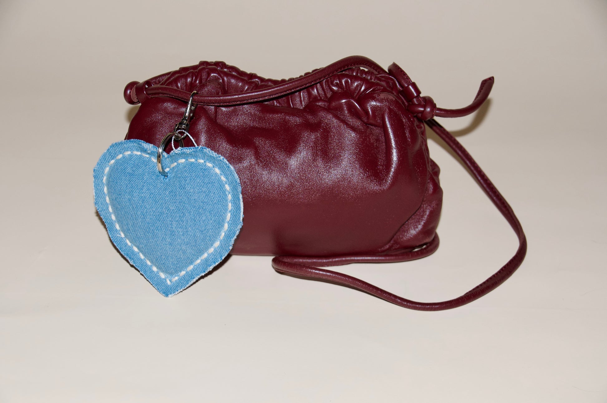 We love because He first loved us. Crafted from premium denim fabric, this heart-shaped charm has an indigo denim hue that is artfully contrasted with white stitching. Clip it onto your go-to tote or thread it through the belt loop of your favorite pants to showcase your fashion creativity + credentials.