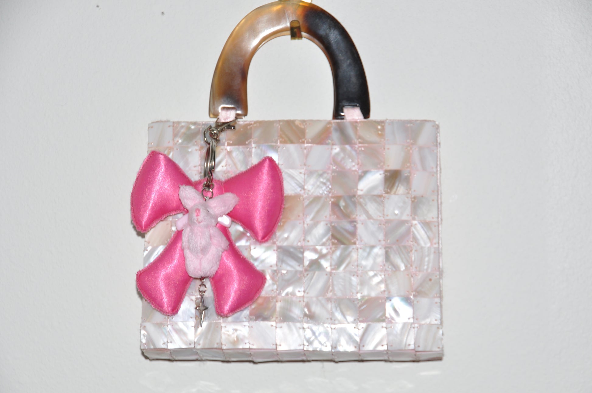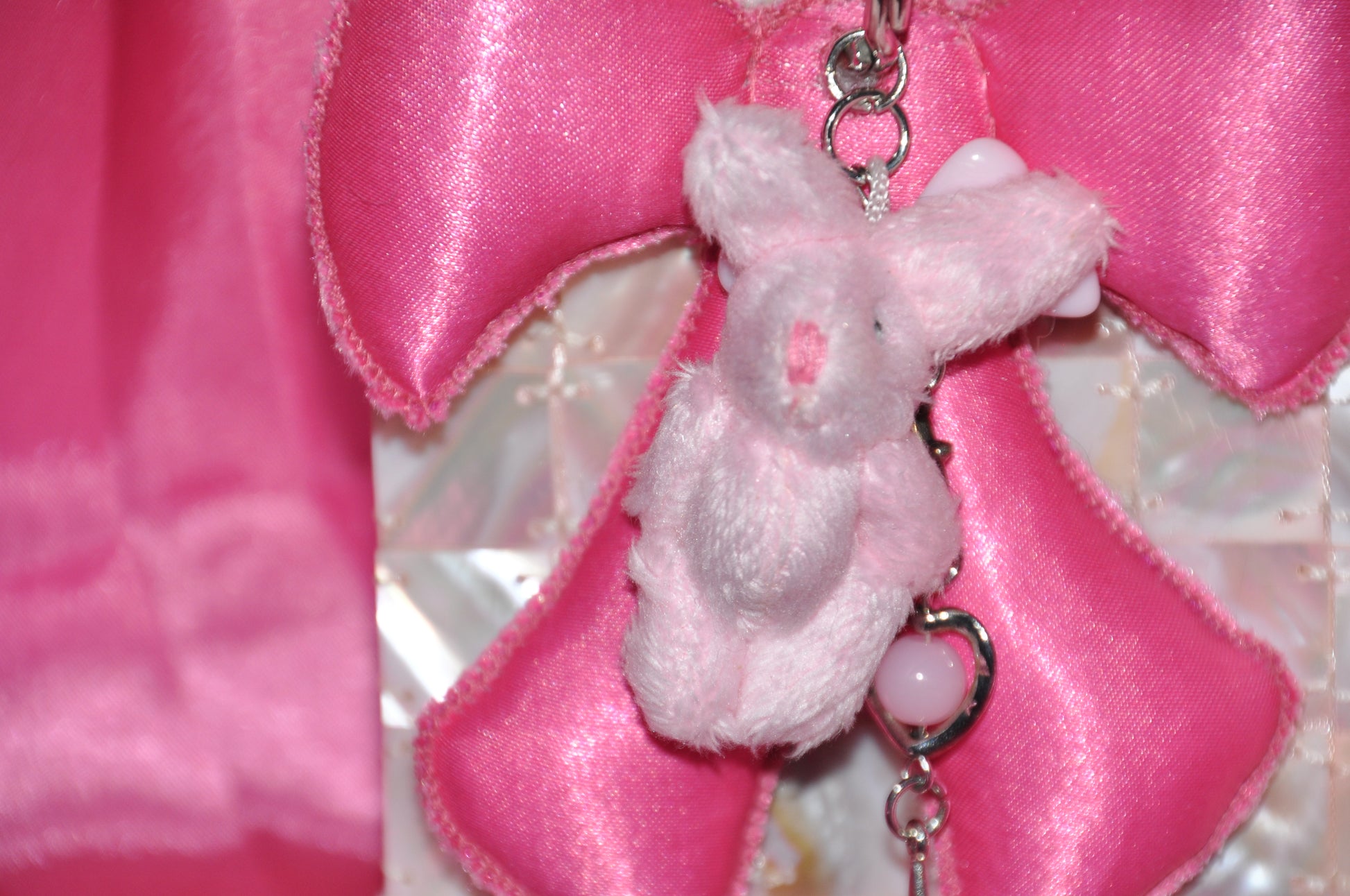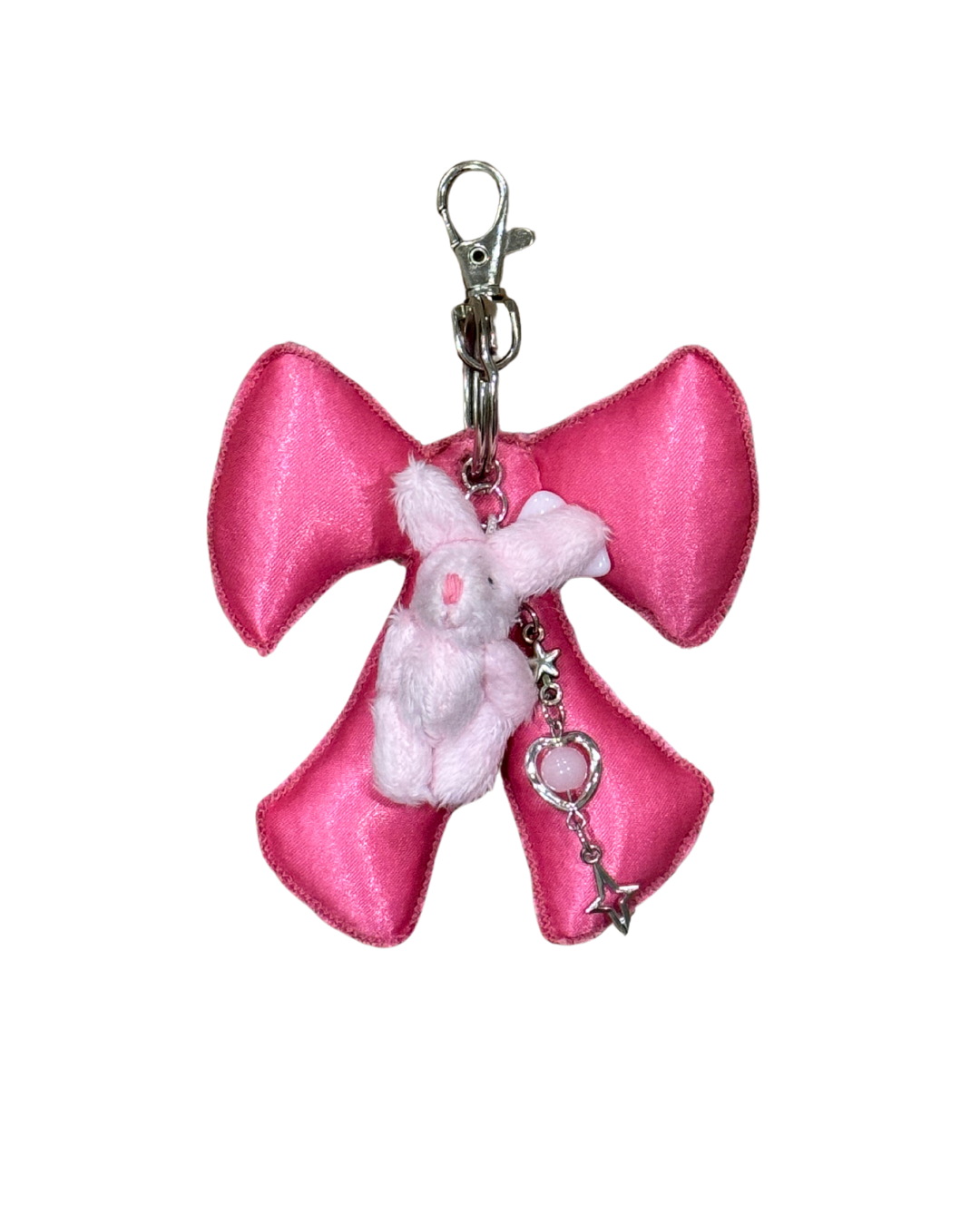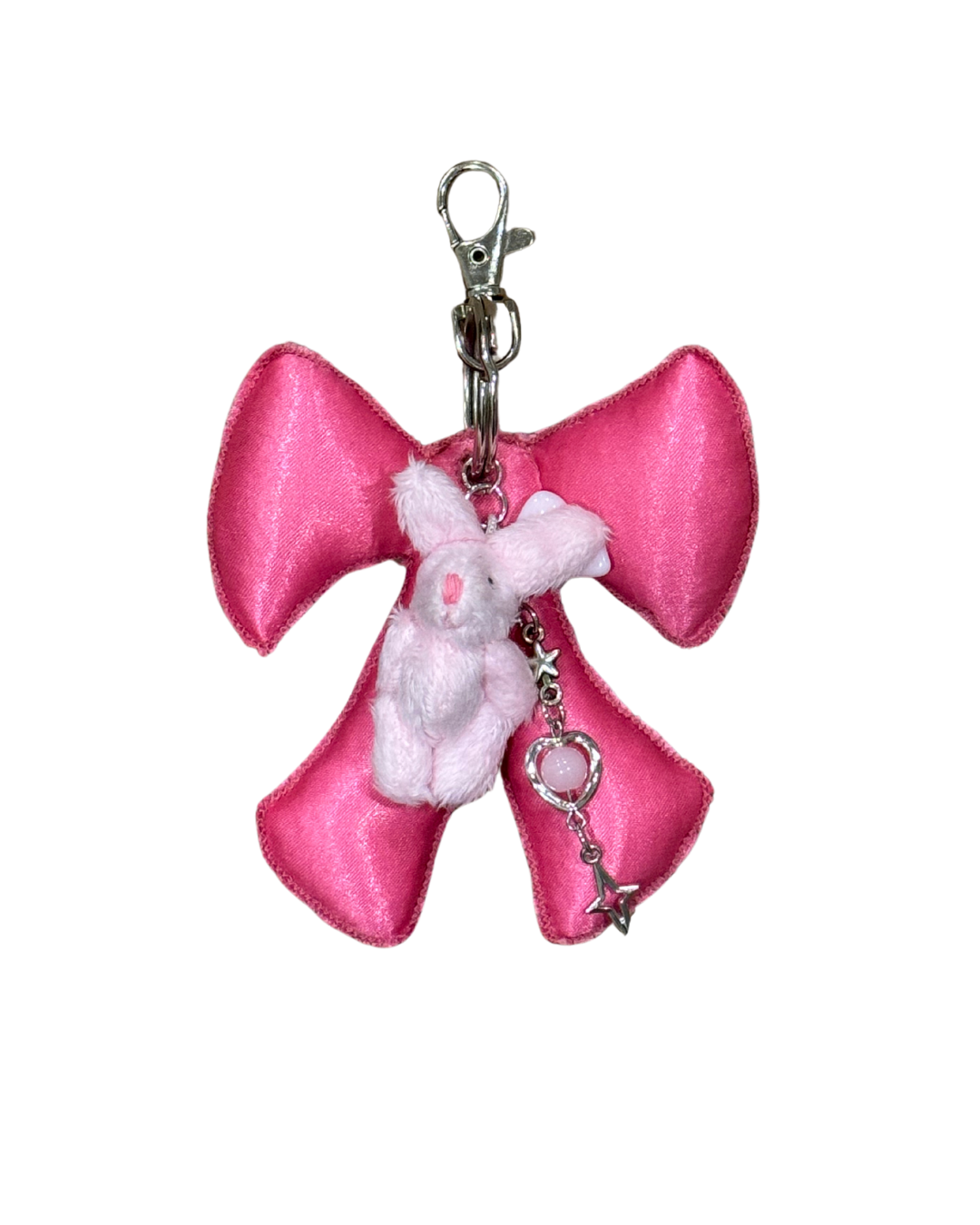 Material: Premium poly satin fabric with iridescent shimmer. Silver metal ring with claw clip.