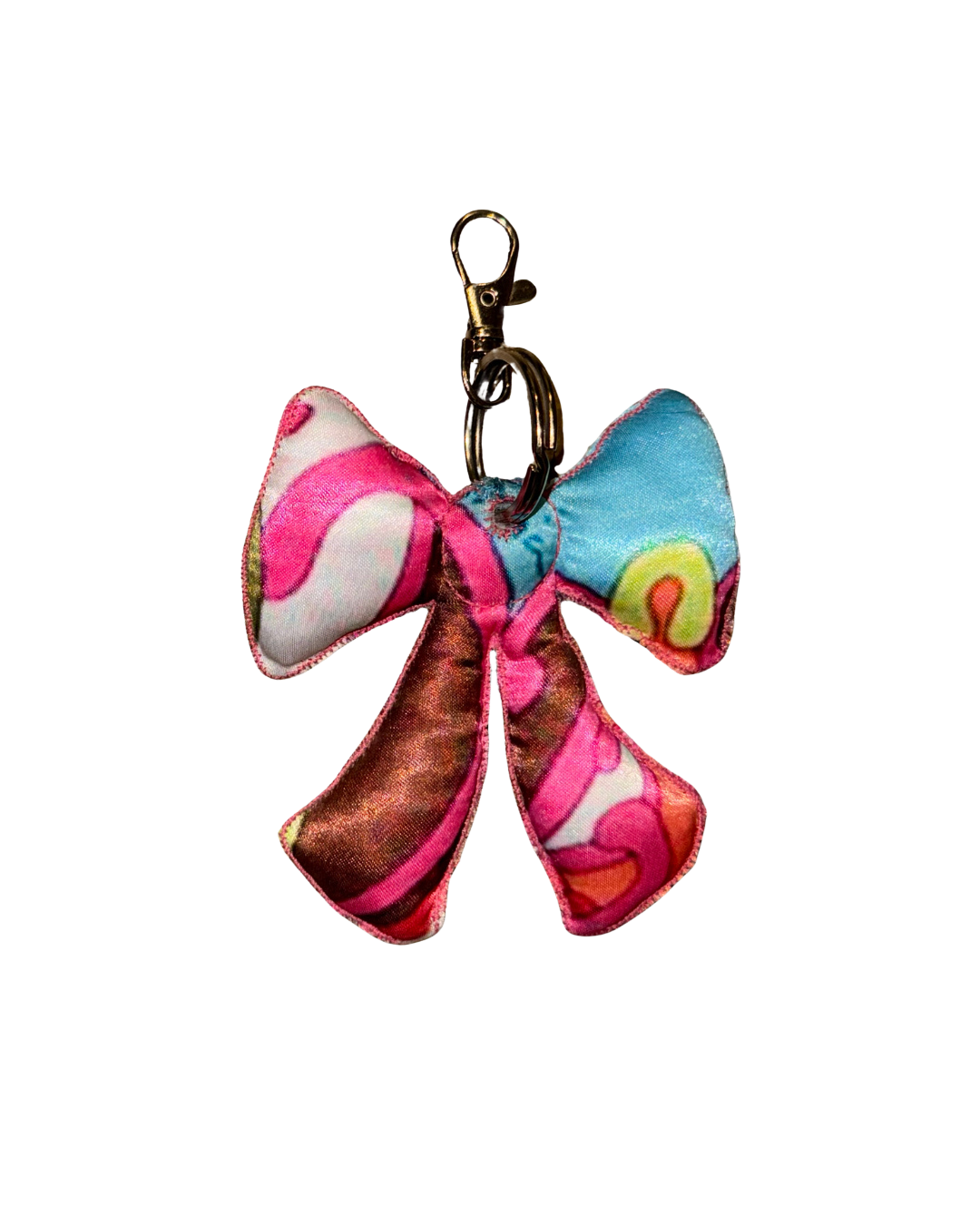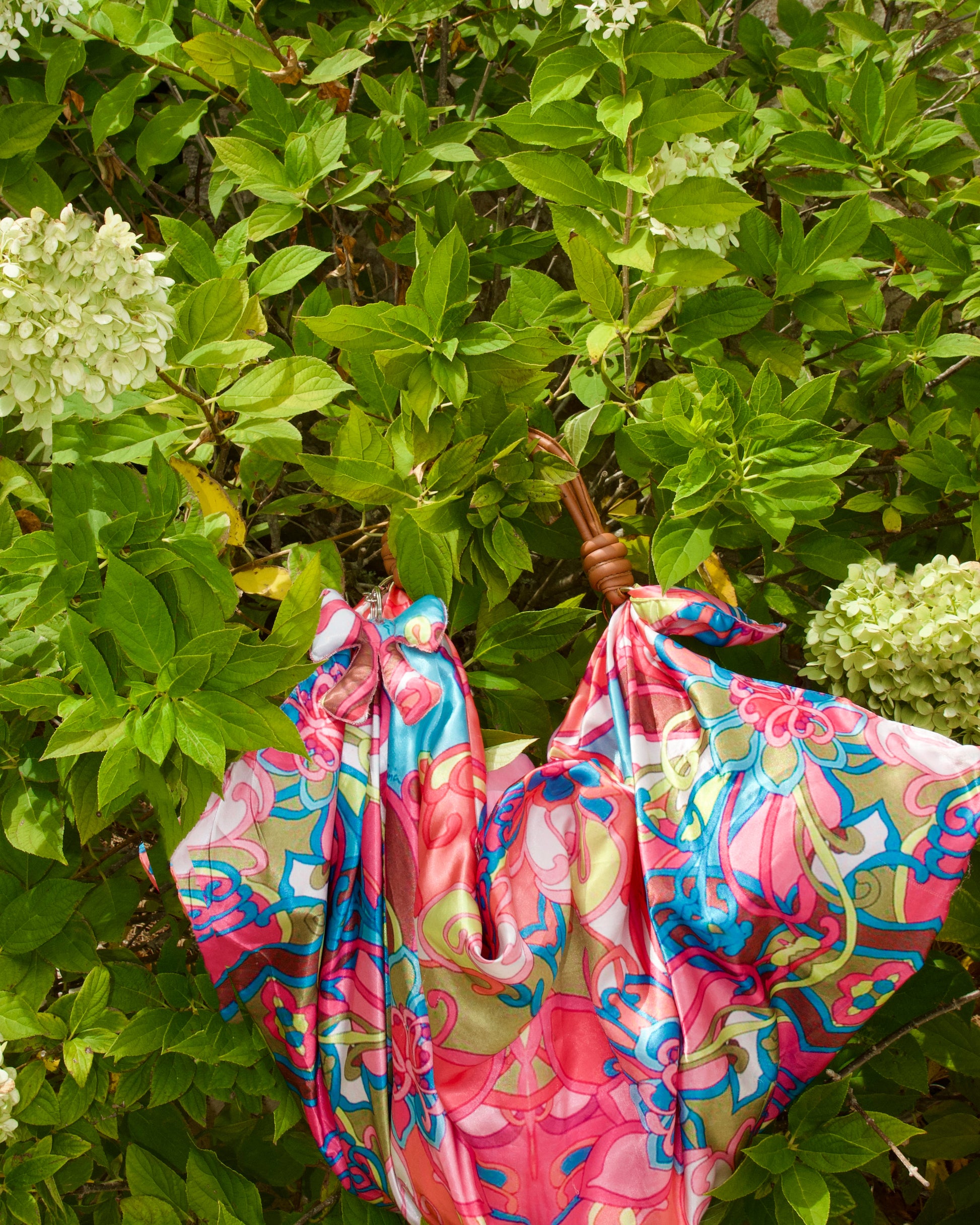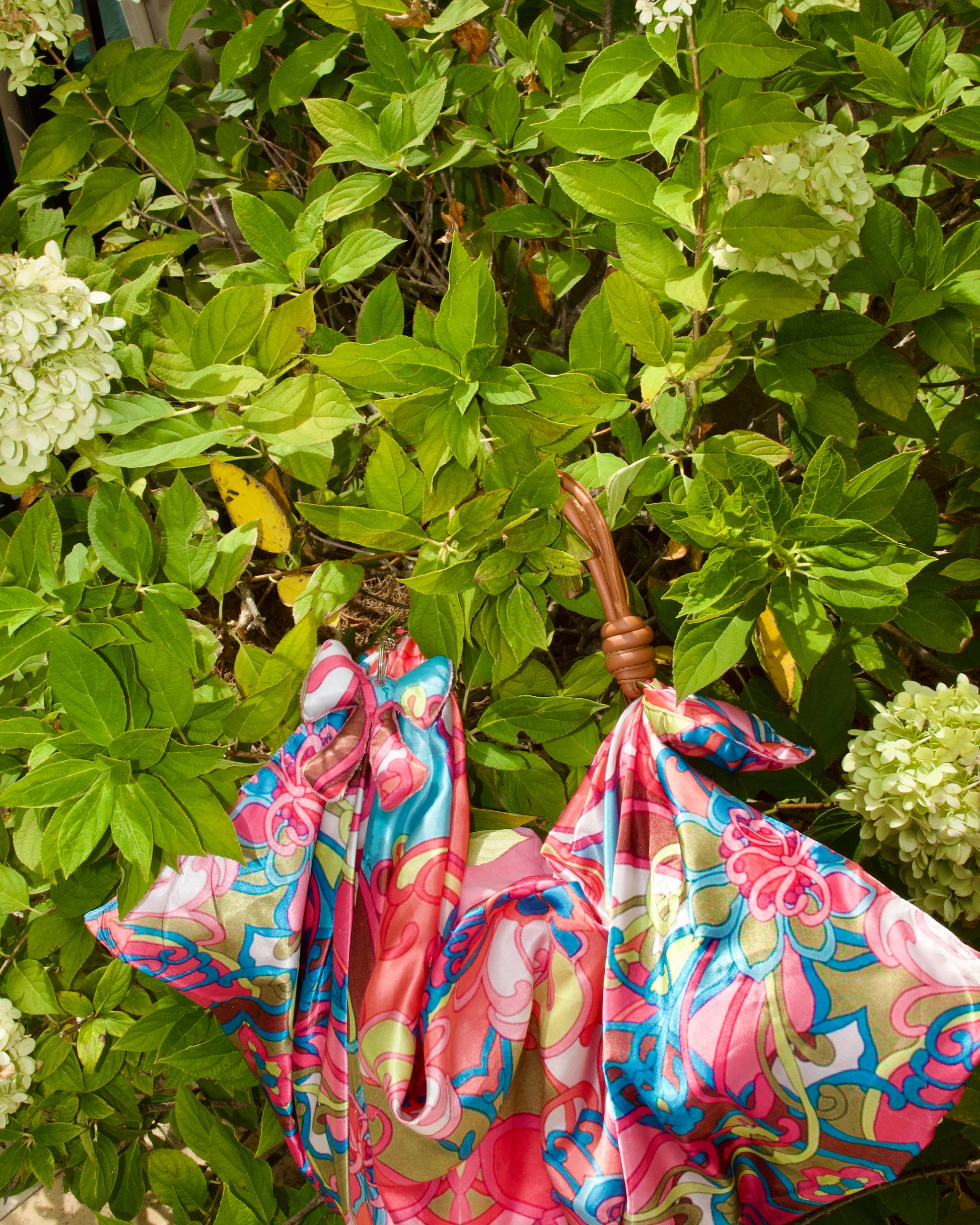 Material: Premium poly satin fabric with iridescent shimmer. Silver metal ring with claw clip.